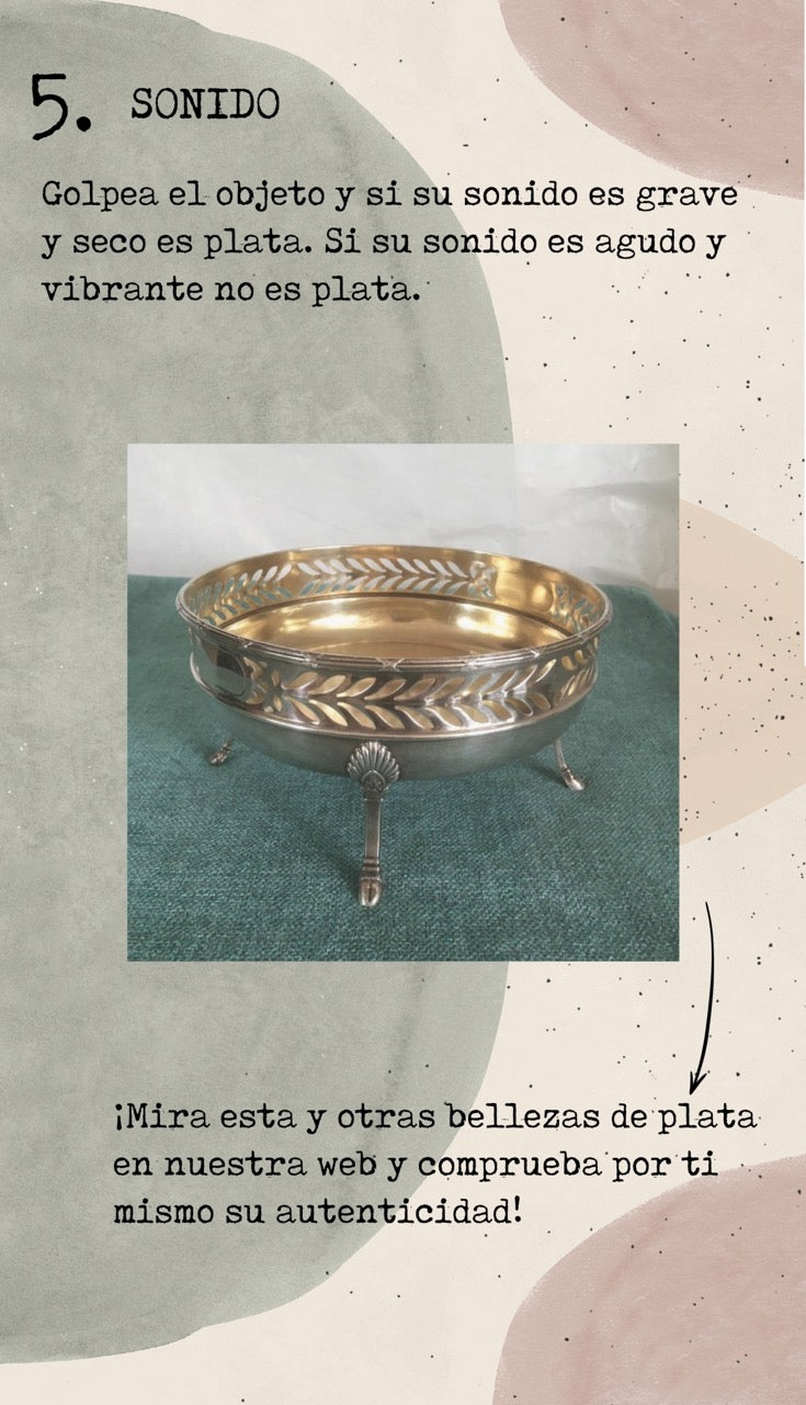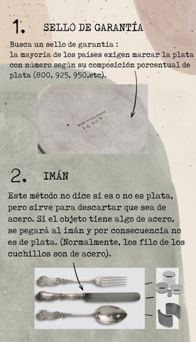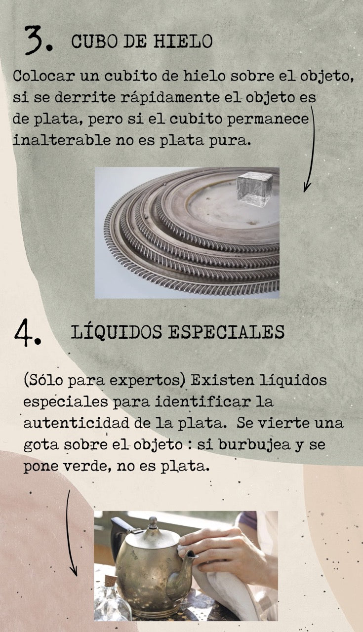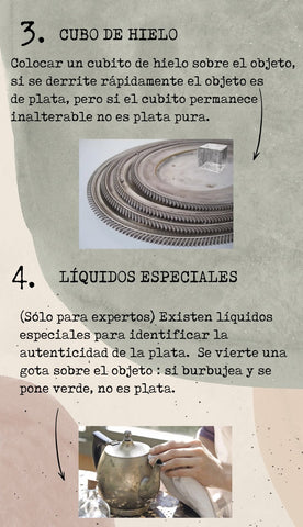 - (Sólo para expertos) Existen líquidos especiales para identificar la autenticidad de la plata, se vierte una gota sobre el objeto y espera unos segundos : si burbujea y se pone verde, no es plata.