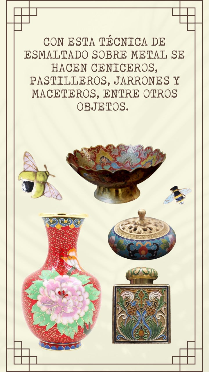 Con esta técnica de esmaltado sobre metal se hacen ceniceros, pastilleros, jarrones y maceteros, entre otros objetos. Es un arte muy complejo y elaborado que cada vez se produce menos y a mayores costos.