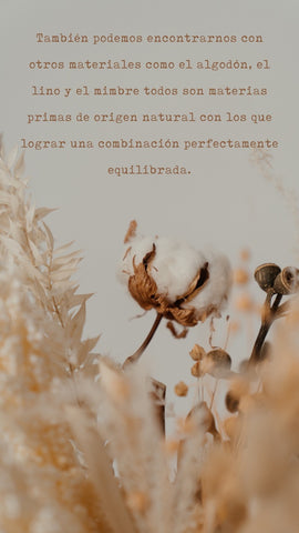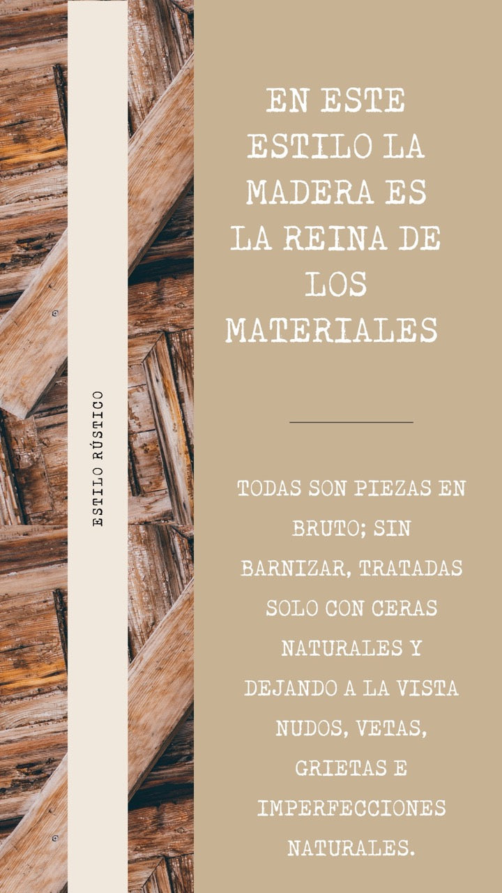 En este estilo la madera es la reina de los materiales especialmente empleada en los muebles y objetos fabricados con pino, roble, haya y teka. Todas piezas en bruto; sin barnizar, tratadas solo con ceras naturales y dejando a la vista nudos, vetas, grietas e imperfecciones naturales. Así mismo también podemos encontrarnos con otros materiales como el algodón, el lino y el mimbre todos son materias primas de origen natural con los que lograr una combinación perfectamente equilibrada.
