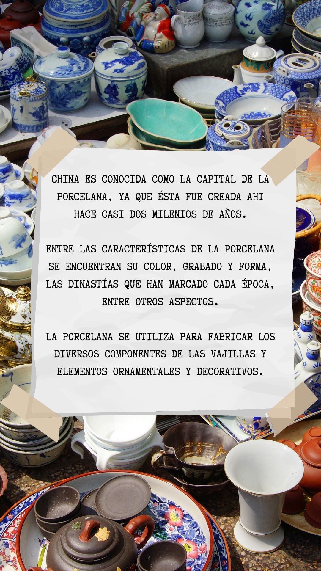 En relación a la porcelana, China es conocida como la capital de ésta, ya que fue creada ahi hace casi dos milenios de años. La porcelana se utiliza para fabricar los diversos componentes de las vajillas y elementos ornamentales y decorativos.