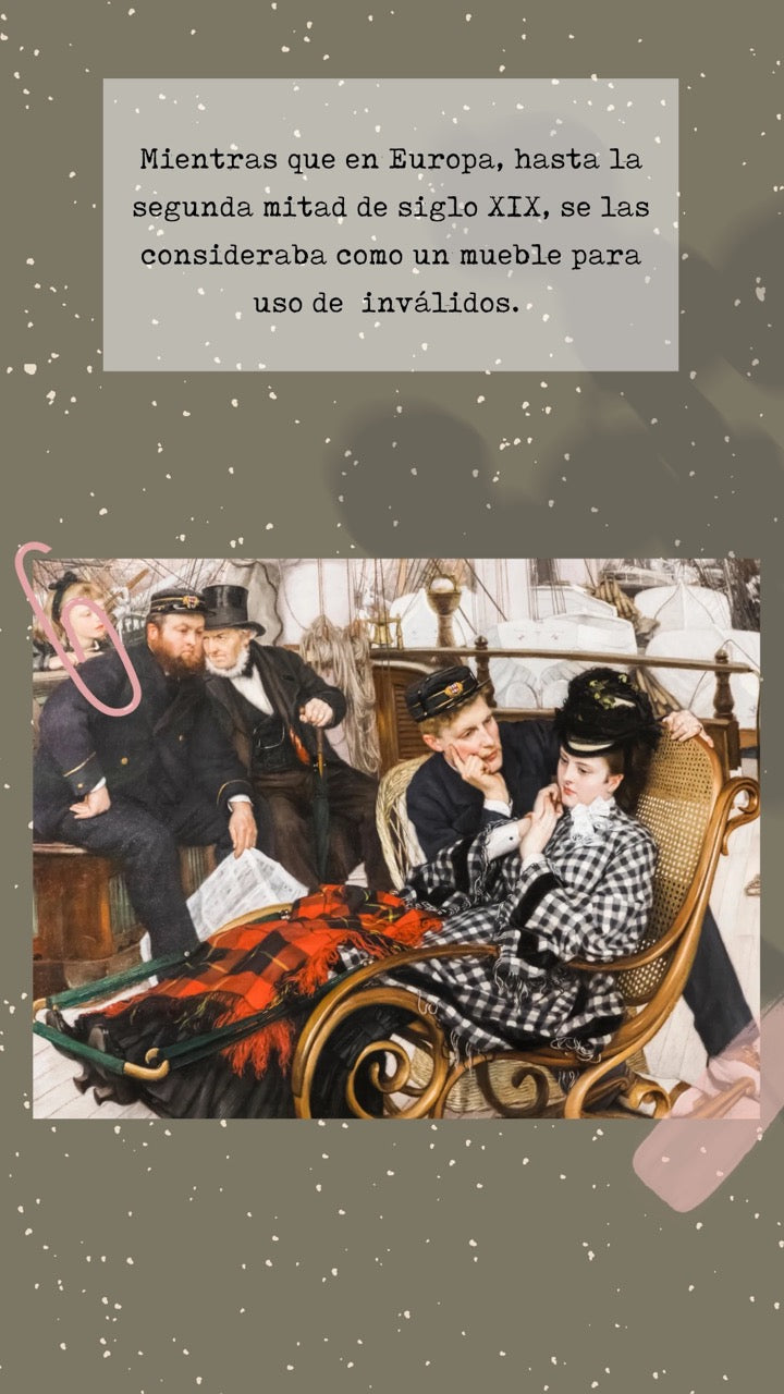 La silla mecedora está asociada al relajo por el balanceo que produce y según el mito americano, fue inventada por Benjamin Franklin en el año 1787 en las colonias inglesas de norte América, lo que luego sería Estados Unidos.