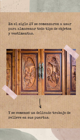 En el siglo XV se comenzaron a usar para almacenar todo tipo de objetos y vestimentas y se comenzó un delicado trabajo de relieve en sus puertas. Recién en el siglo XIX, los armarios comenzaron a tener nuevos diseños, se agregaron cajones, se equiparon con espejos, y se fabricaron en diferentes tipos de madera. Cuando las técnicas de construcción fueron evolucionando, se empezaron a ver los armarios empotrados. Modelo que tiene visible sólo la parte frontal ya que los laterales y la parte trasera se encuentran insertos en el muro.