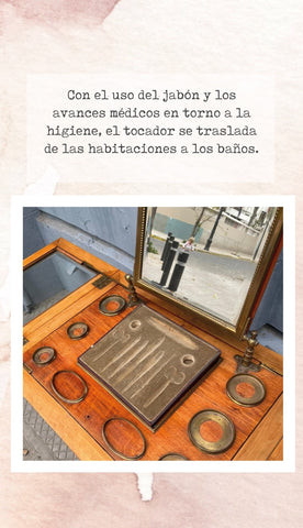 El tocador es uno de los muebles que mejor refleja los cambios sociales. Los primeros tocadores fueron desarrollados en el Antiguo Egipto y consistían en unas cajas en donde se almacenaba todo lo necesario para un ritual de belleza. Fue en la Europa del s.XVIII donde logró mayor esplendor y variedades. Con el uso del jabón y los avances médicos en torno a la higiene, el tocador dejó de ser habitual en las habitaciones y se trasladó a los baños.