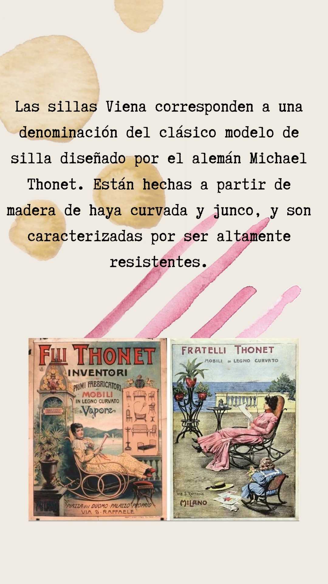 Las sillas Viena corresponden a una denominación del clásico modelo de silla diseñado por el alemán Michael Thonet. Están hechas a partir de madera de haya curvada y junco, y son caracterizadas por ser altamente resistentes.