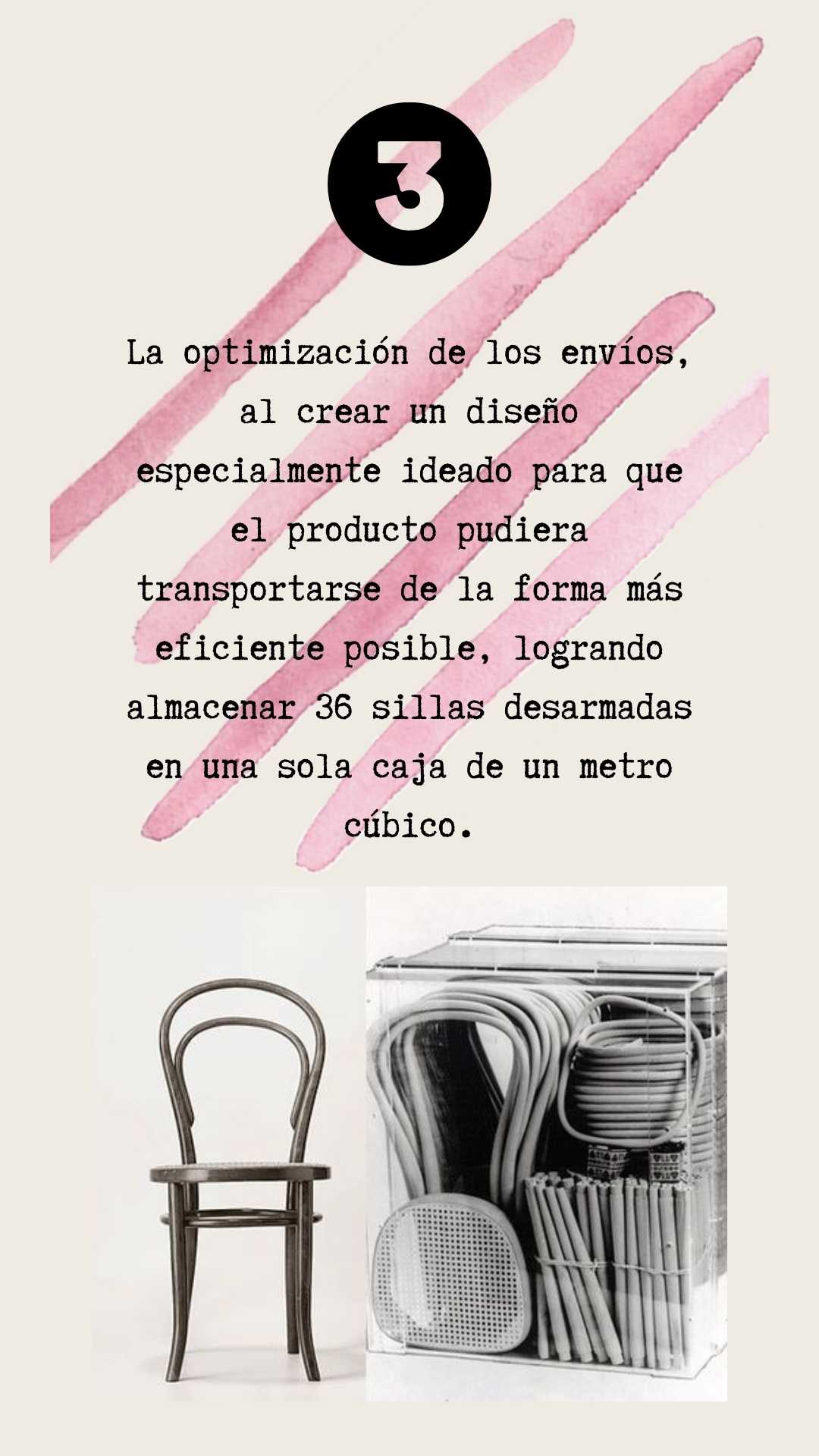 - La optimización de los envíos, al crear un diseño especialmente ideado para que el producto pudiera transportarse de la forma más eficiente posible, logrando almacenar 36 sillas desarmadas en una sola caja de un metro cúbico.