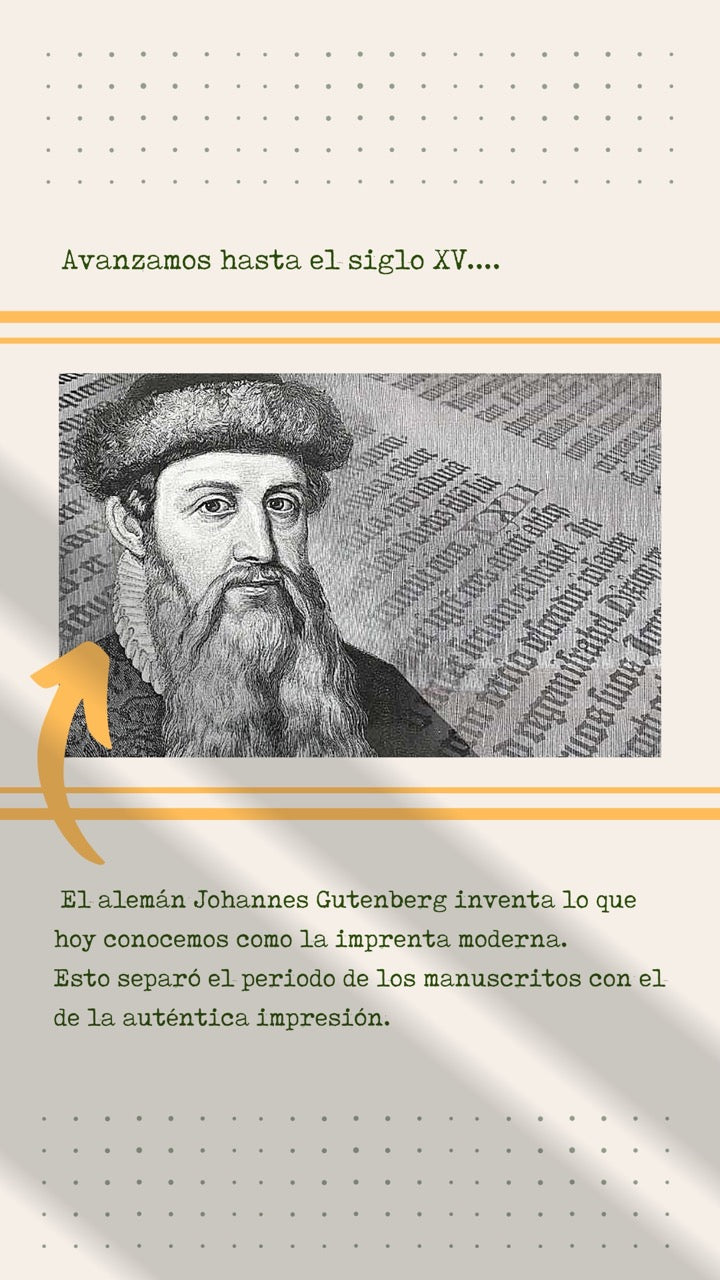 Hasta el XV en Europa la imprenta surgió como una derivada de la xilografía, luego el alemán Johannes Gutenberg (1394- 1468) inventa lo que hoy conocemos como la imprenta moderna, en donde perfeccionó las técnicas existentes en su época y las aplicó en una sola máquina: la imprenta. Esto separó el periodo de los manuscritos con el de la auténtica impresión.