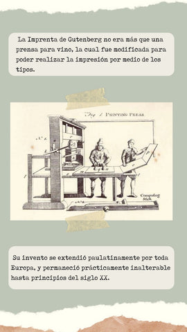 La Imprenta de Gutenberg no era más que una prensa para vino que fue modificada para poder realizar la impresión por medio de los tipos. Su invento se extendió paulatinamente por toda Europa, y permaneció prácticamente inalterable hasta principios del siglo XX.