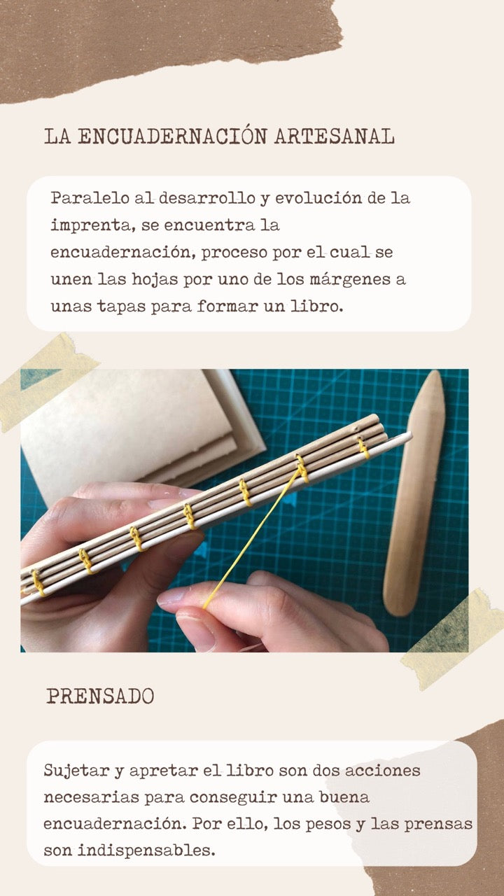 En paralelo al desarrollo y evolución de la imprenta, se encuentra la encuadernación, proceso por el cual se unen hojas por uno de los márgenes a unas tapas para formar un libro. Para este proceso se necesita una prensa para sujetar y apretar el libro, dos acciones necesarias para conseguir una buena encuadernación. Por ello, los pesos y las prensas son indispensables.