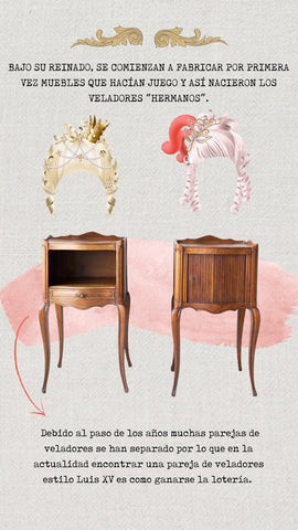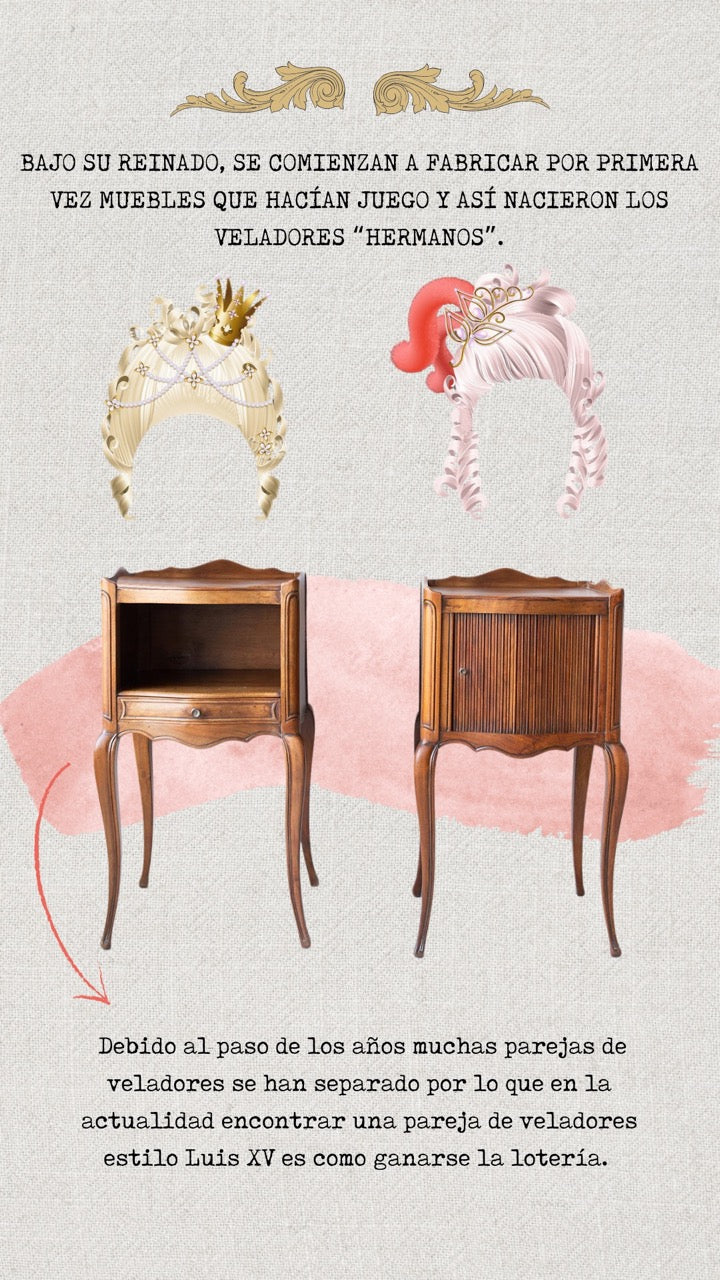 Bajo su imperio se comienzan a fabricar por primera vez muebles que hacían juego y nacen los veladores “hermanos”, y que debido al paso de los años muchas parejas de veladores se han separado y en la actualidad encontrar una pareja de veladores estilo Luis XV es como ganarse la lotería.