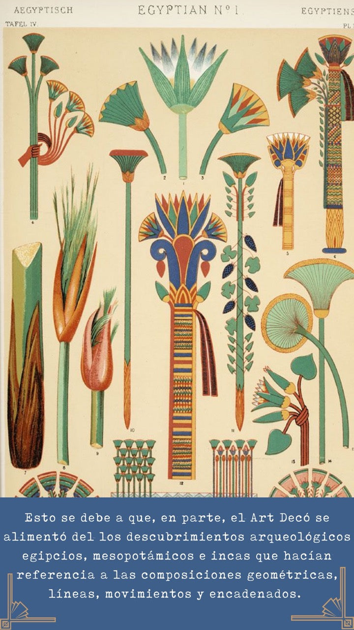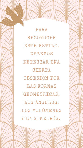 Para reconocer este estilo, debemos detectar una cierta obsesión por las formas geométricas, los ángulos, los volúmenes y la simetría. Esto se debe a que el Art Decó se alimentó del cubismo, del surrealismo, y de los descubrimientos arqueológicos egipcios, mesopotámicos e incas que hacen referencia a las composiciones geométricas, líneas, movimientos y encadenados.