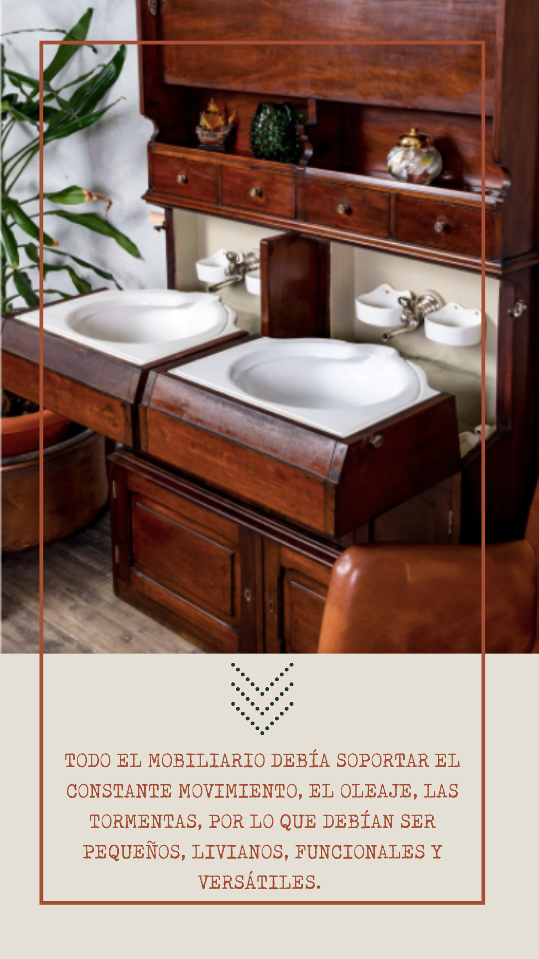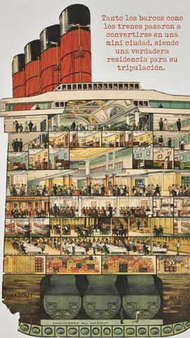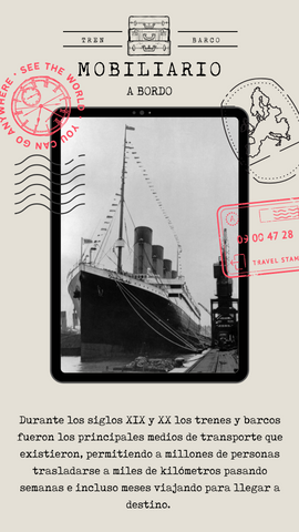 Tanto los barcos como los trenes pasaron a convertirse en una mini ciudad, siendo una verdadera residencia para su tripulación. Todo el mobiliario debía soportar el constante movimiento, el oleaje, las tormentas, por lo que debían ser pequeños, livianos, funcionales y versátiles para así cumplir más de una función debido al espacio reducido de estas mini polis andantes. Gran parte del mobiliario era de procedencia inglesa y francesa, debido a su elegancia, empleo de materiales y confecciones.