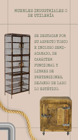 A todos estos elementos que conforman el mobiliario de este tipo de espacios se le suele denominar muebles industriales, o muebles de utilería que se destacan por su aspecto tosco e incluso semi-acabado y libres de pretensiones, de carácter funcional y dejando de lado lo estético. Predominan materiales como el hierro, acero, la madera de aspecto rústico y los tapizados en cuero y chapas. La gama de colores está compuesta de grises , cafés, tonos cobrizo y negro.