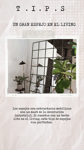Los espejos con estructuras metálicas son un must de la decoración industrial . Si cuentas con un techo alto en el salón, este tipo de espejos van perfectos