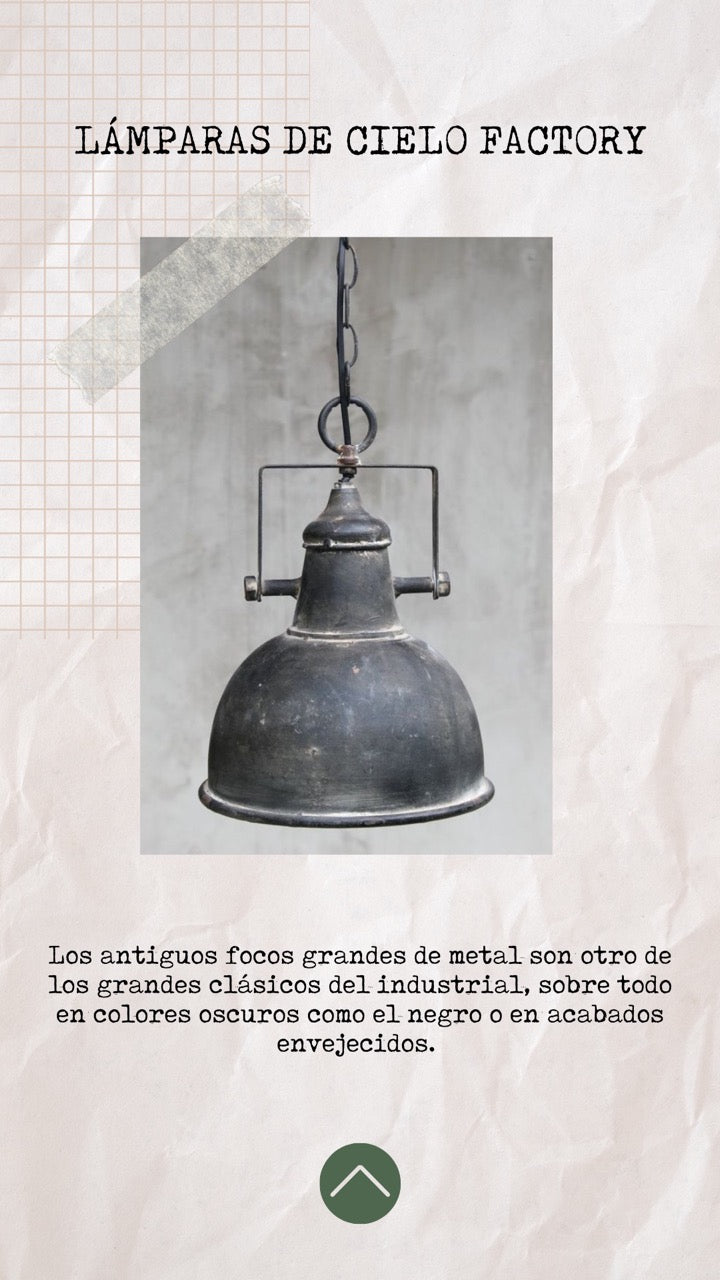 Los antiguos focos grandes de metal son otro de los grandes clásicos del industrial, sobre todo en colores oscuros como el negro o en acabados envejecidos .
