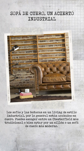 Los sofás y las butacas en un salón de estilo industrial por lo general están acabados en cuero . Puedes escoger entre un Chesterfield más tradicional o bien optar por un sillón o un sofá de cuero más moderno.