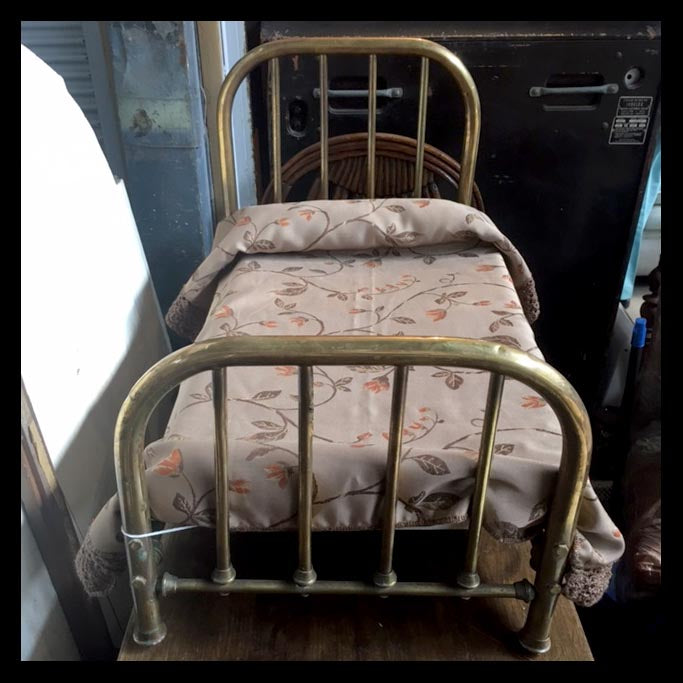 Entre las muñecas antiguas, las más conocidas y apreciadas en el mundo del coleccionismo son las de porcelana, pues también las hubo de madera, papier maché y cera. Se fabricaron en Europa entre 1840 y 1920. Desde la antigüedad, las muñecas han jugado un rol central en los rituales mágicos y religiosos, y han sido tradicionalmente juguetes para niños. Adicionalmente han sido coleccionados por los adultos, por su valor nostálgico, su belleza, su importancia histórica o valor financiero.Esta es una cama de bronce para muñecas. Somier y colchón a medida.Mide 74 x 43 cm.