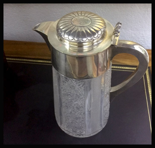 Juego de tres jarros de cristal y plaqué. El cuerpo de los jarros es de cristal, y su mango, parte superior y boca de plaqué.Cada uno tiene distintas terminaciones, mangos más curvos o más rectos y tapas con detalles tallados.El plaqué es una chapa de metal precioso adherida a otro metal de menor valor. El que más se trabaja es de plata y son menos comunes el de oro o platino. El plaqué es una invención inglesa moderna que llegó a Francia a comienzos de 1800. Ha logrado un gran esplendor, ya que con menos recursos logra la misma elegancia y brillo que otros metales.