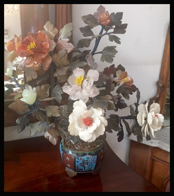 Este arbolito esta hecho de piedra dura y tiene múltiples hojas y grandes flores en tonos rojo, rosado y blanco. Su base es de cloissoné, una antigua técnica decorativa consistente en aplicar esmalte vidriado sobre materiales metálicos. El trabajo consiste en que sobre una base de metal, se hace un fino dibujo con un alambre de cobre fundido y se van poniendo los polvos esmaltados para luego hornearlos. El orden en que se pone cada color es fundamental y se comienza por aquellos que resisten más calor. En este caso la tonalidad de la base es principalmente roja y calipso.