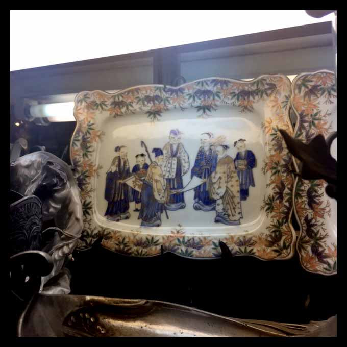 Estos son un par de platos de porcelana de origen chino que datan del año 1800. Ambos tienen al centro una escena de figuras humanas, rodeada por una greca floral en todo el contorno. Miden 25 // 15 cm.