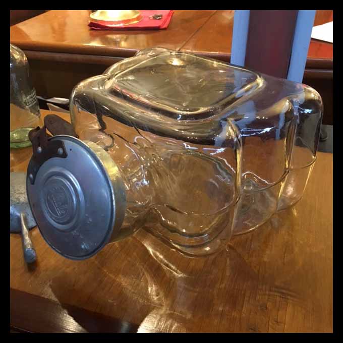A principios del siglo XX, todos los almacenes vendían la mayoría de sus productos a granel. Es por esto que todos los envases y utensilios de almacén, eran objetos sumamente importantes y funcionales que debían, además, ser bellos pues estaban exhibidos y en constante vínculo con el público. Esta es una dulcera de vidrio con tapa metálica que se utilizaba para exhibir y vender caramelos de distintos tipos.