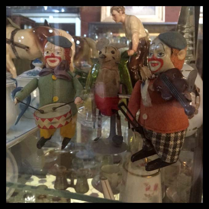 Par de figuras alemanas Schuco de colección. Son payasitos de latón forrados con fieltro y tienen instrumentos musicales que emiten sonidos haciéndolos funcionar a cuerda.