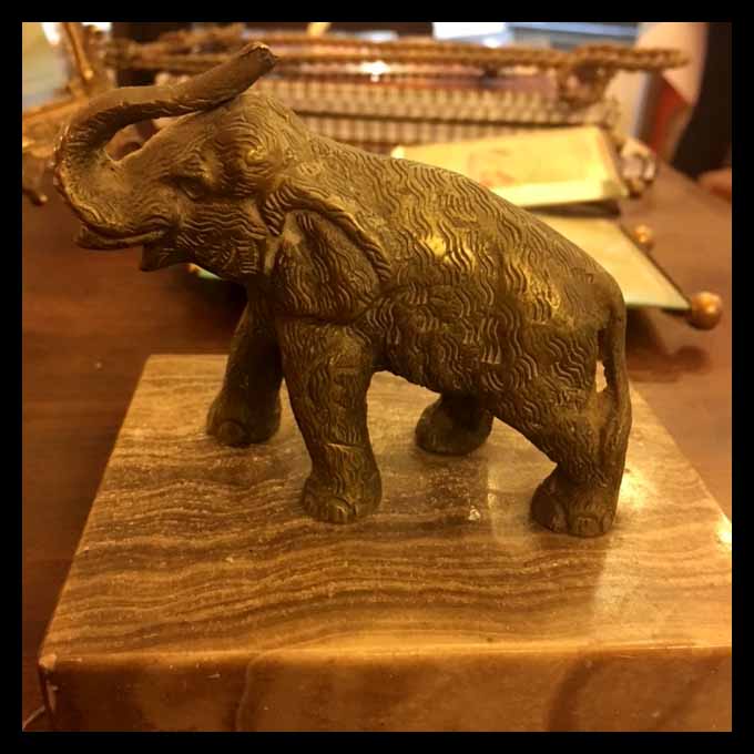 Par de apoya libros. Tienen una base de mármol claro y figuras de elefantes de bronce sobre ella.