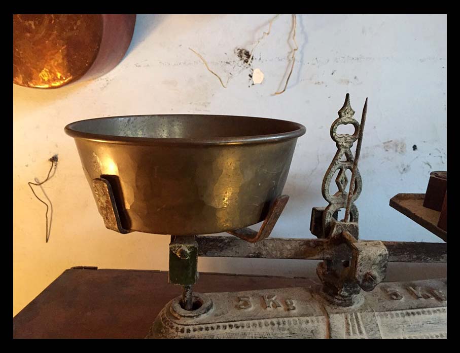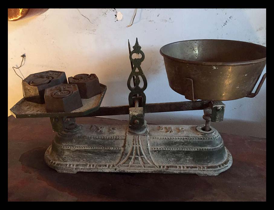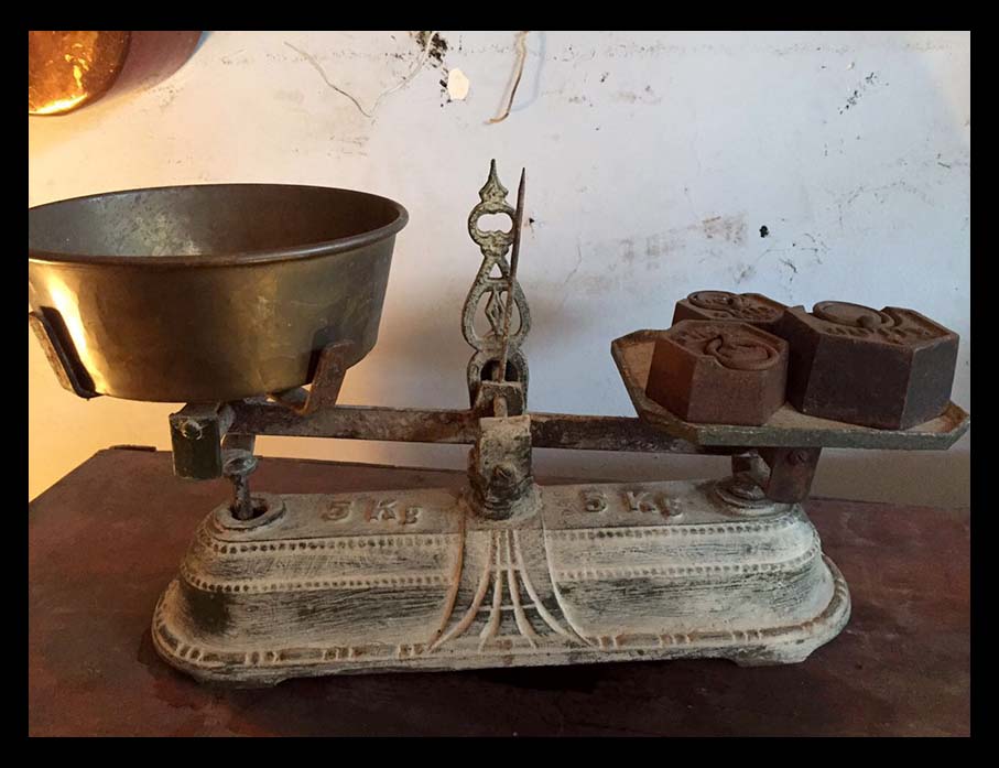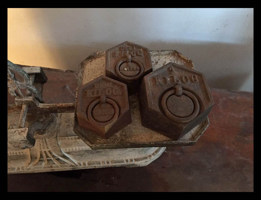 Las pesas antiguas se utilizaban principalmente en almacenes y confiterías para pesar los alimentos. Actualmente, muchas de esas pesas son utilizadas con fines más bien decorativos, siendo solo algunas de ellas también pesas funcionales.Gran pesa antigua con base de fierro y bandeja de bronce.
