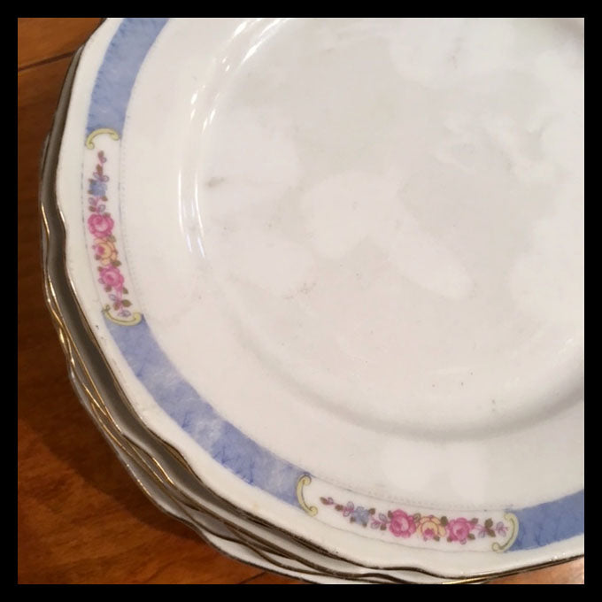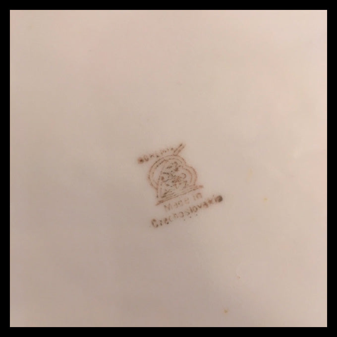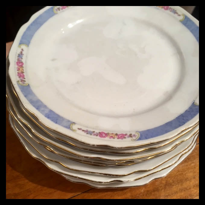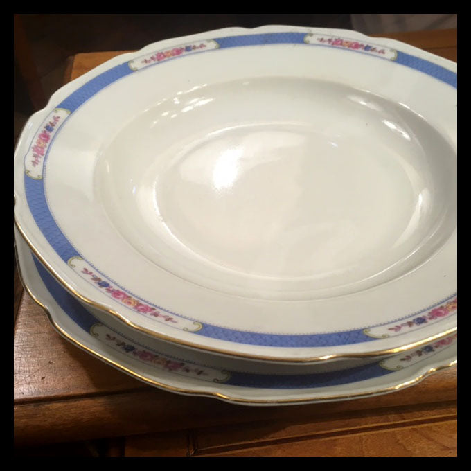 Las formas de servir la mesa son un reflejo de las costumbres, cultura y maneras de ser de las personas. Dentro de los objetos que componen una mesa uno de los más relevantes son los juegos de loza. Este es un juego de loza checa blanco que tiene un borde celeste y dorado con pequeñas florcitas en tonos rosados. Con el paso del tiempo se han perdido y roto algunas piezas. Incluye 13 platos de fondo, 9 platos hondos, 9 platos de pan y 2 platos de tamaño similar a los platos de pan. Algunos platos tienen desgastes en sus bordes.