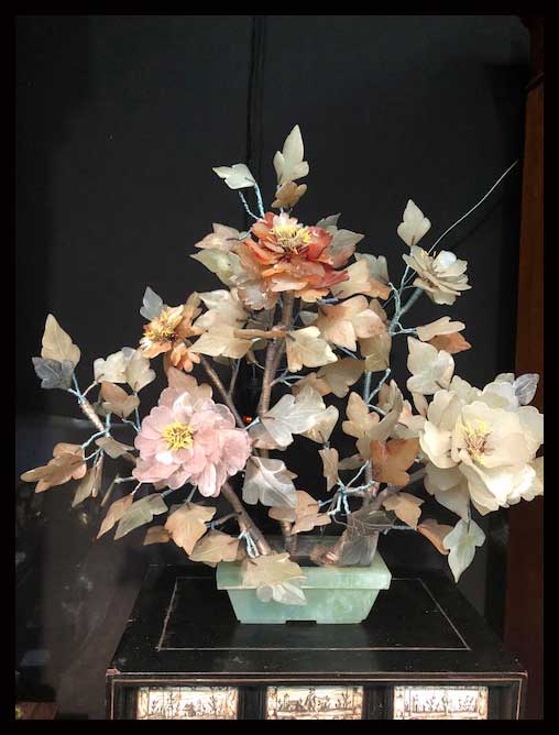 Decorar espacios con motivos florales y propios de la naturaleza es algo que se ha usado desde hace siglos. No sólo se han replicado flores y árboles en porcelana, metales, vidrios y piedras, sino también se han estampado y dibujado estos motivos en telas y loza y se han tallado en madera.Este árbol está hecho de piedra dura. Tiene hojas y flores hechas con distintos colores.