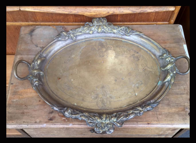 Bandeja de servir de bronce con decorados en asa y cubierta. Se entrega bronceada completa. Probablemente esta bandeja perteneció a un juego de servir el té y se componía de otras piezas que han seguido otros rumbos. El té, originario de Asia, llegó a Europa a finales del siglo XVII. Comenzó a popularizarse su consumo y con eso crecieron también las formas y posibilidades de servirlo. A fines del s.XVIII comenzaron a desarrollarse juegos completos de servir que incluían la bandeja.