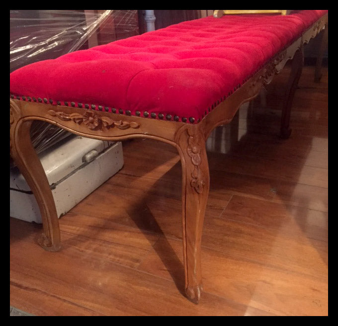 Banca larga de madera tallada estilo provenzal. Tapiz nuevo de felpa roja y terminaciones en bronce. Tiene 2 metros de largo y 46 cm de ancho.