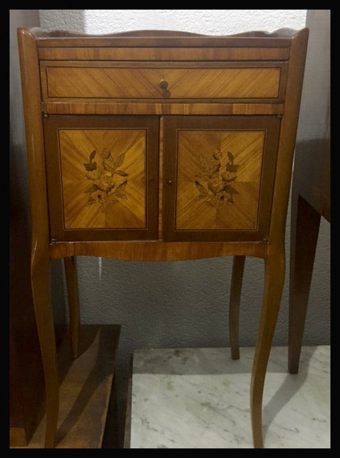 Velador alto francés estilo Luis XV con marquetería en frutales y dos compartimentos. Estilizadas y livianas formas.Puede dársele uso como mesa de apoyo, lateral o velador. Tiradores y terminaciones en bronce.