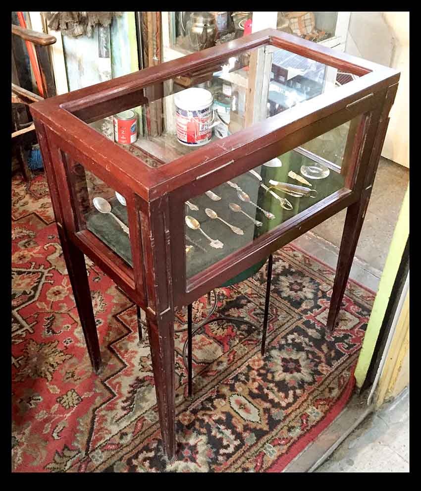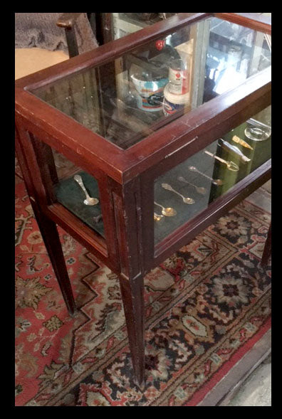 Los gabinetes con puertas vidriadas, que tomaron el nombre de vitrina, surgen en 1700, junto con la moda por coleccionar y exponer porcelana importada de China. Desde ese entonces hasta nuestros días, las vitrinas han variado en estilo y forma.Esta pieza es una vitrina tipo arrimo de cortes rectos y totalmente vidriada. Sus dimensiones son 64x36x80 cm de alto.Hoy, el principal uso que se le dan a las vitrinas es en los comedores o espacios de estar para almacenar copas, botellas, vajilla o cualquier elemento para servir la mesa. Un uso alternativo es para exponer objetos de colección que se quieran tener resguardados.