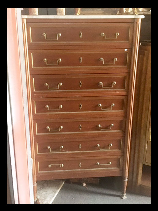 Se cree que el origen de la cómoda está relacionado con la evolución que presenta el cuerpo inferior del armario. A partir del siglo XVI es cuando comienza a aparecer esta pieza en la historia del mobiliario doméstico. Desde que surge, presenta más o menos las mismas características.Esta cómoda alta de 7 cajones, tiene terminaciones de bronce y cubierta de mármol. Sus medidas son 80 x 40 x 160 cm aprox.