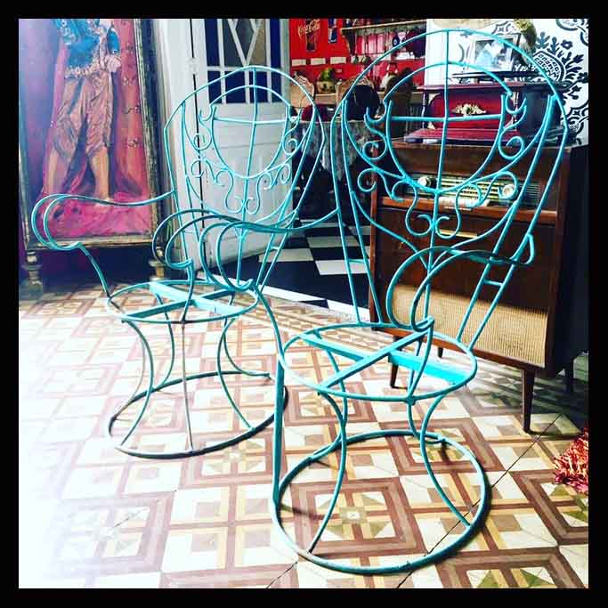 Desde el siglo XIX, comenzó a trabajarse con especial dedicación en mobiliario y artefactos de fierro forjado para decorar los jardines de las estancias. Todas estas piezas destacan por la curvatura y delicadeza de su forma y decorados. Tienen además la característica de enfrentar de mejor manera la corrosión de la intemperie.La dificultad de soldar tales piezas de fierro curvado ha hecho que se utilice principalmente para muebles y objetos decorativos.Estas son un par de sillas de fierro forjado con respaldo alto.