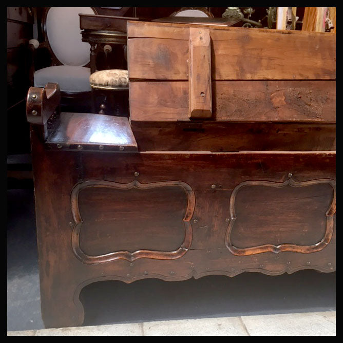 Banca rectangular de madera, sin respaldo, cuyo asiento funciona como la tapa de un baúl. Sus medidas son: 178 cm de largo // 42 cm de ancho // 58 cm de alto.