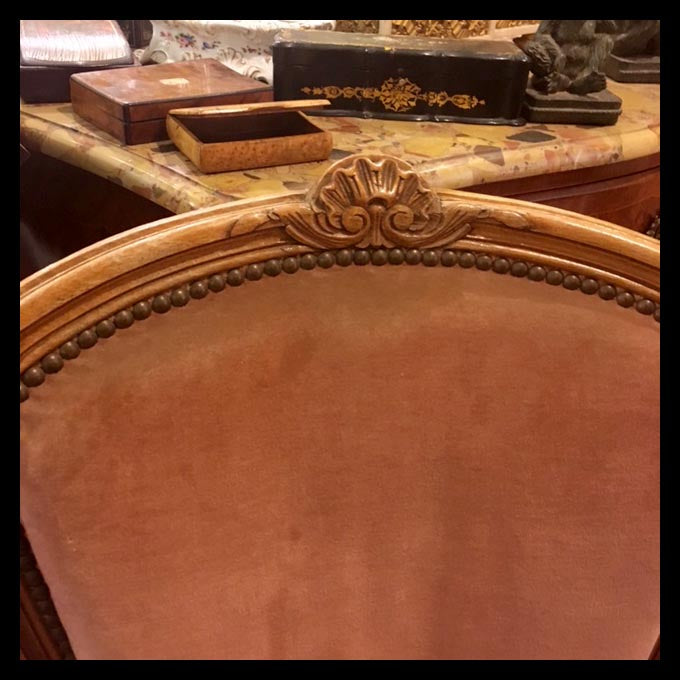 Inicialmente una silla en una vivienda no solo era un objeto en el cual uno se sentaba, sino que era un elemento de elegancia, dignidad y solvente economía. Este mueble era utilizado especialmente por la realeza o la gente con poder económico, por esa razón muchos de los nombres de los diferentes modelos actuales datan de siglos pasados, ya que los diseñadores de éstas, mostraban respeto a los reyes colocándole el nombre a las sillas como el caso de la silla victoriana o silla reina.Par de sillas francesas de madera tallada. Tienen patas cabriolé y terminaciones con tachas de bronce. Están con su tapiz original.