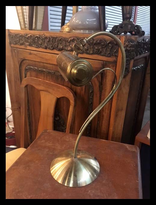 La iluminación de los espacios ha sido una preocupación del ser humano desde la Edad Antigua. Se utilizaron primero antorchas, luego candiles y luminarias a petróleo que se prendían con fuego. La invención de la luz eléctrica permitió diversificar en gran medida el diseño de nuevas formas de iluminación.Lámpara de sobremesa de bronce. Tiene pie curvo y pantalla de forma cilíndrica. Mide 40 cm de alto.