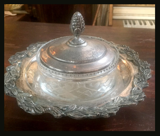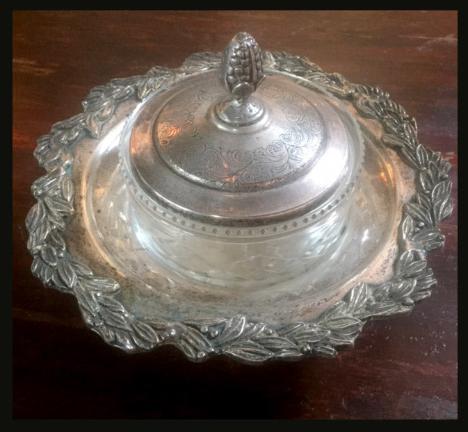 Este pocillo puede tener múltiples usos: para poner azúcar, mermelada, miel u otros. Consta de una bandeja de plaqué decorada, un pote hondo de cristal y una tapa de plaqué.