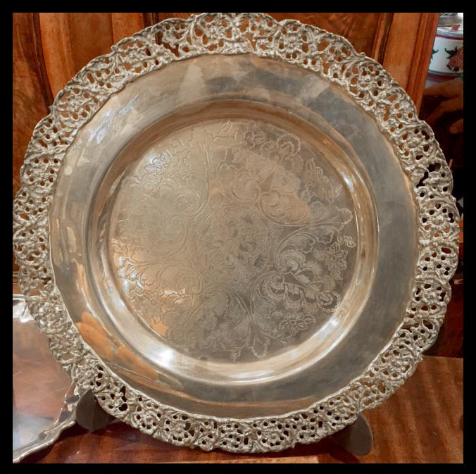 Bandeja redonda de plaqué con decorado central y encaje en el borde.