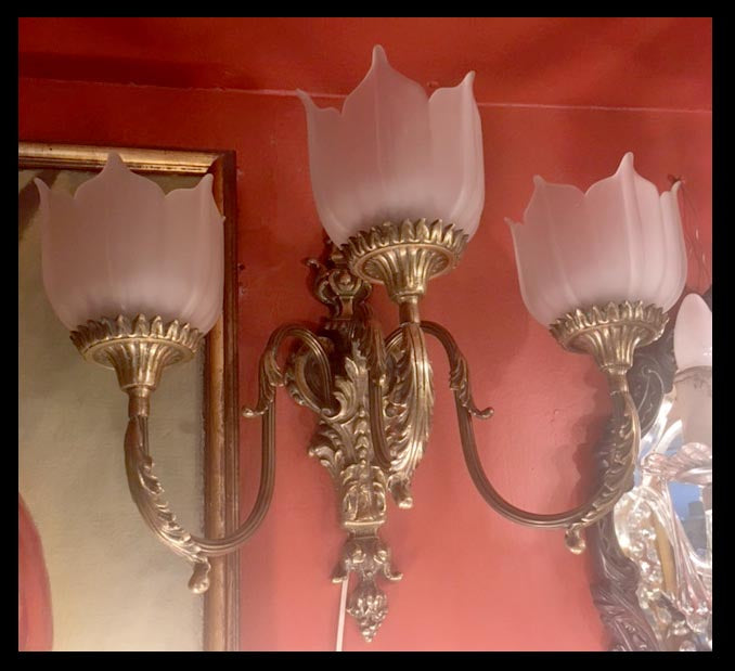 Desde la invención del fuego hasta nuestros días, el hombre ha buscado creativas formas de iluminar los espacios que habita. Al comienzo, eran las antorchas, luego los candiles y luego diversas formas de luminarias a petróleo que se activaban con fuego. Con la invención de la luz eléctrica los diseños y posibilidades de las lámparas aumentaron exponencialmente. Cada país y estilo imperante fue creando diversas formas de alumbrar.Este es un gran apliqué de bronce con 3 brazos y pantallas de vidrio. Mide 50 x 35 x 45cm.