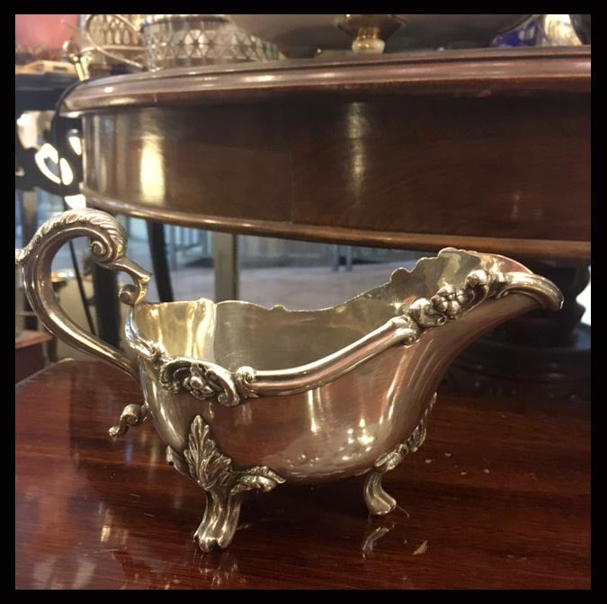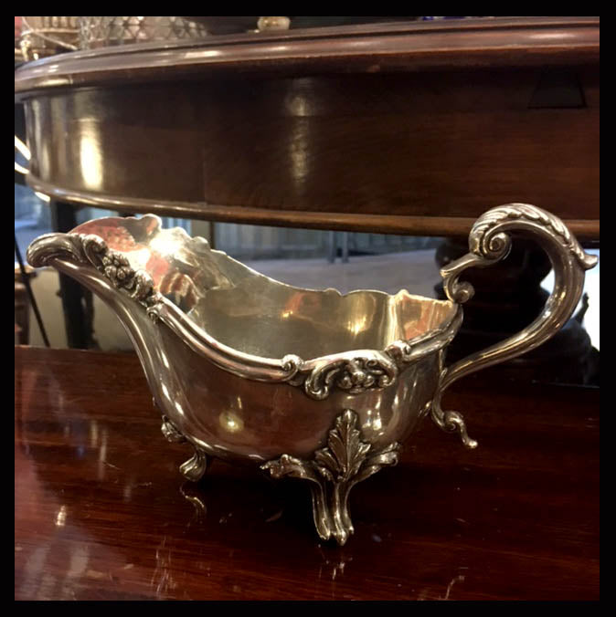 Hasta el siglo XVII se acostumbraba a servir las salsas en un pocillo muy similar a una taza. Es a comienzos de 1700 que surge el modelo de salsera con forma de canoa y pico, que se sustenta sobre una base central o patas; y en 1800, que se asemeja a una pequeña sopera con patas.Este es un salsero con un asa y ornamentaciones florales.