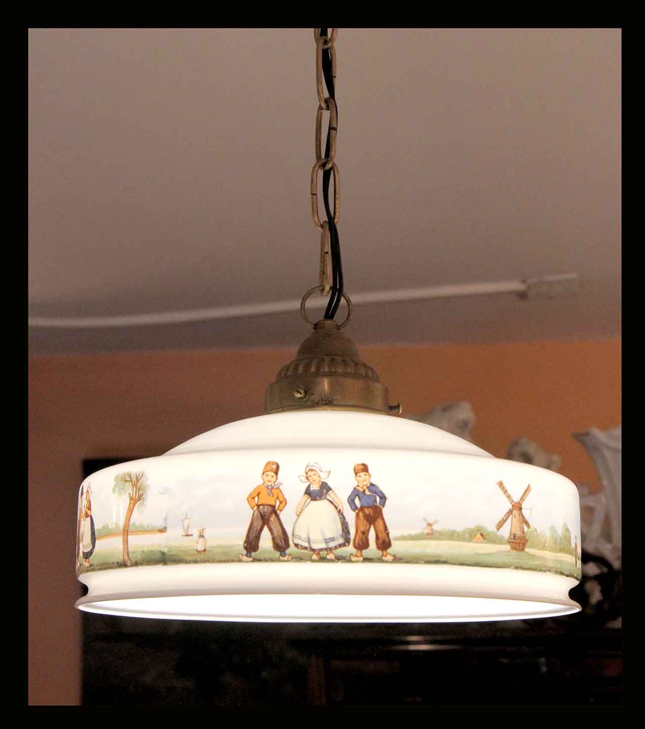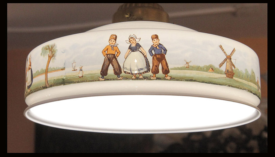 Lámpara de opalina pintada de los años 20. Muestra motivos infantiles: niños en el campo entre árboles y molinos. Originalmente el borde de la lámpara llevaba un fleco de cristal que hoy ya no posee.