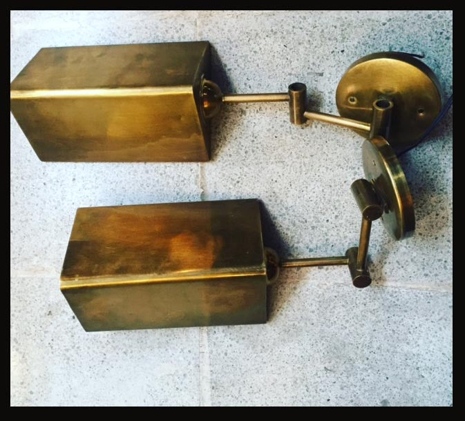 Lámparas de bronce de muro con brazo y pantalla regulable para direccionar la luz. Gran utilidad para iluminar cuadros u objetos específicos.