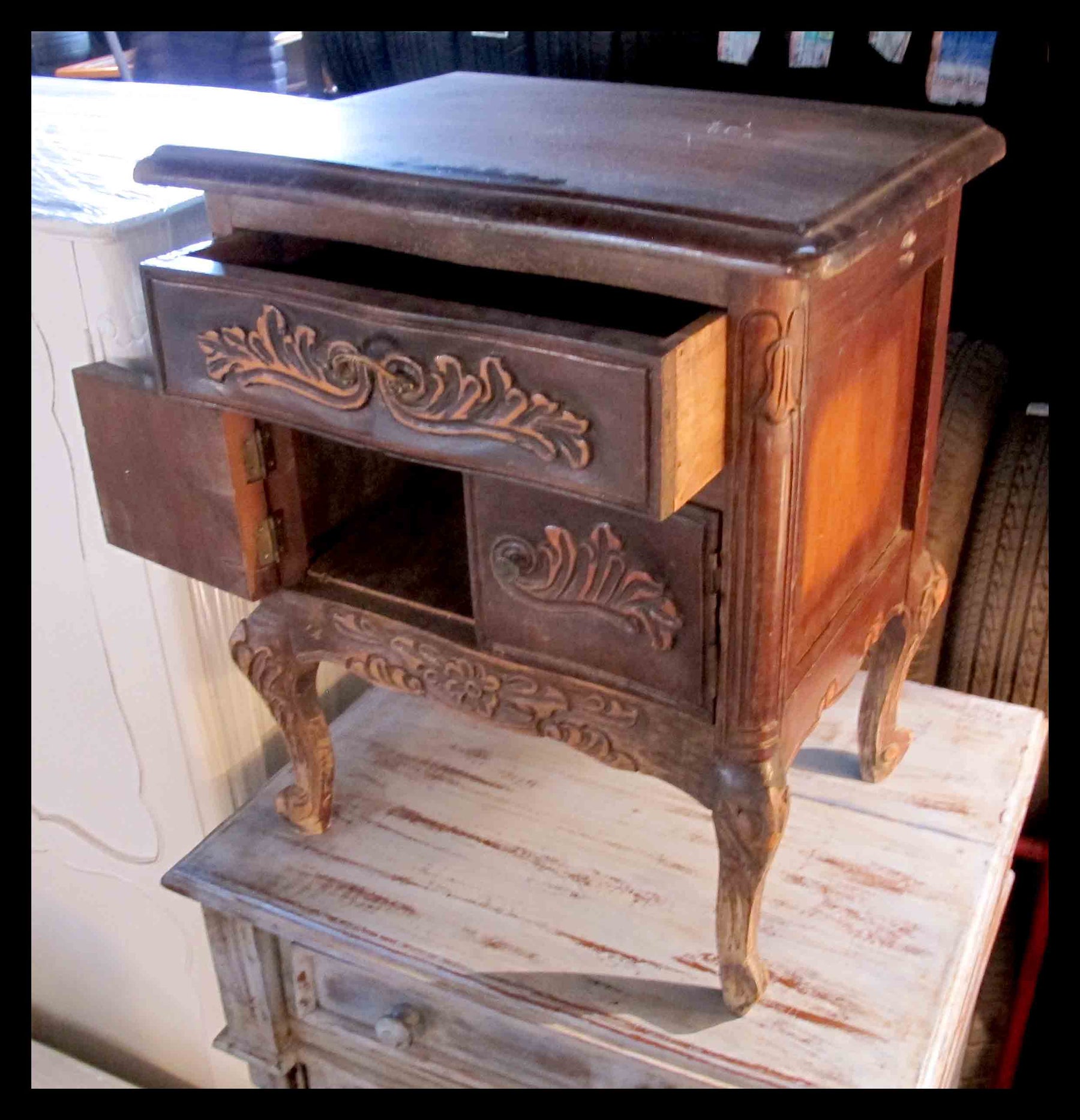 Velador de madera tallado con un cajón y dos puertecillas. Patas cariolé y tiradores de bronce.TI.241 VELADOR DE MADERA TALLADAEVendido$Vendido