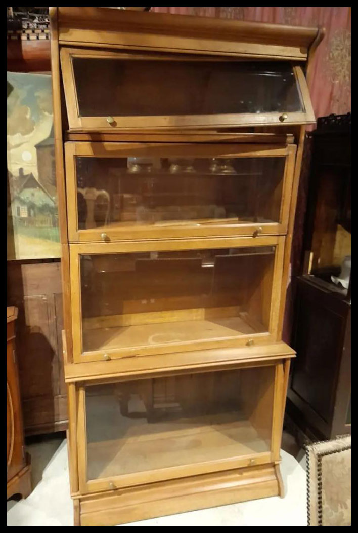 Este mueble es un clásico librero Thompson , pero con la particularidad de tener las puertas vidriadas. Toda su estructura es de roble americano. Las puertas se abren hacia arriba y se sujetan mediante correderas superiores, pudiendo quedar abiertas sin tener que sostenerse. Es un clásico librero de barco cuyas partes se apilan entre si pudiendo tener distintas alturas y ser fácilmente transformado y transportado .