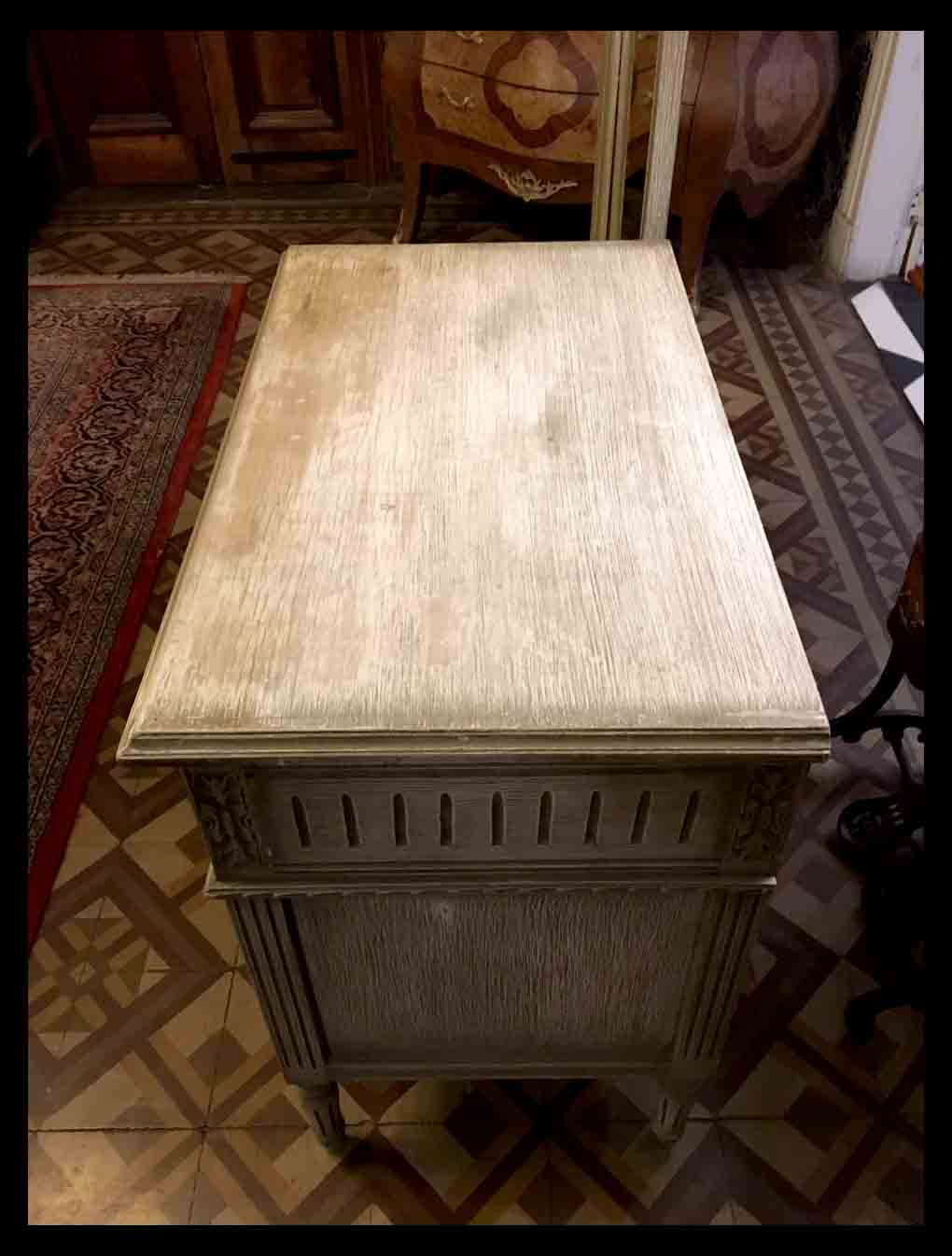 La confección de muebles ha sido una preocupación humana desde tiempos antiguos. Lo que en un comienzo se reducía a fines prácticos fue cada vez más motivo de diseño y belleza convirtiendo a los muebles en verdaderas obras de arte. Con el paso del tiempo, la belleza del mobiliario se fue complementando con la versatilidad funcional, haciendo muebles que puedan cumplir más de un rol.Este es un mueble con una doble funcionalidad. Tiene por un lado una cómoda con cuatro cajones y por el otro un largo espejo con un cajón inferior, que sirve como peinador. Es completo de madera tallada pintada con una pátina gris verdoso que es original. Tiene pequeños desgastes en la cubierta. Mide 137 // 46 // 162 (alto espejo) cm.