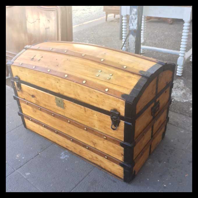 Este es un baúl de madera clara con franjas de madera más oscura que sobresalen. Las esquinas están pintadas de negro y viene con sus cerraduras funcionando en buen estado.