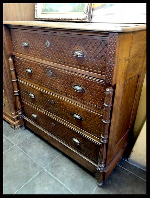 Cómoda oscura de madera tallada con diseño geométrico. Tiene cuatro grandes cajones con cerradura central y dos tiradores de bronce, uno a cada lado.Tiene balaustres decorativos por la parte delantera.Medidas: 105 cm // 53 cm // 105 cm.