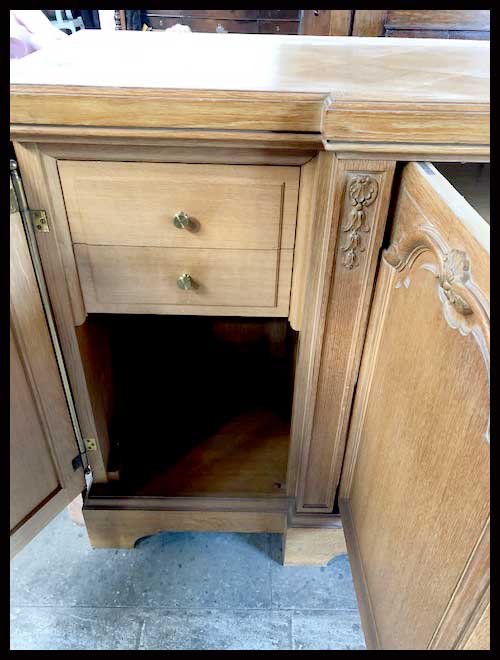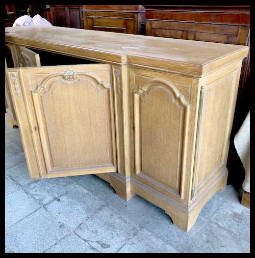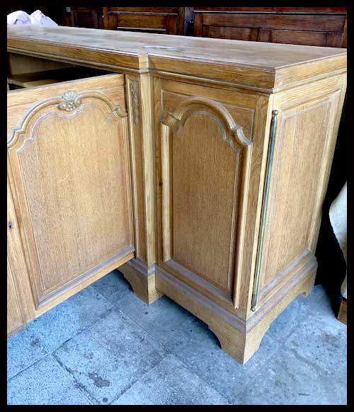 Arrimo largo de madera. Tiene terminaciones más bien simples, con molduras en las puertas que recubren sus repisas. Es de madera de encina y viene firmado.Viene desmontado, para armar.Mide 218 cm // 56 cm // 98 cm.